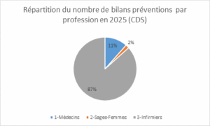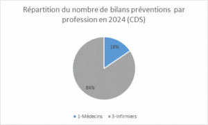 Dans les centres de santé : En 2025, la répartition est très différente : les infirmier·ères réalisent 87 % des bilans, contre 11 % pour les médecins et 2 % pour les sages-femmes. En 2024, les infirmier·ères étaient déjà majoritaires avec 84 % des bilans, les médecins représentant 16 %.