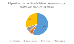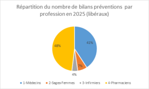 Chez les libéraux : La répartition des bilans par profession en 2025 (janvier-novembre) montre une forte implication des médecins (41 %) et des pharmacien·nes (48 %), suivis des sages-femmes (7 %) et des infirmier·ères (4 %). En 2024, les médecins dominaient également avec 57 % des bilans, devant les pharmacien·nes (30 %), les infirmier·ères (7 %) et les sages-femmes (5 %).